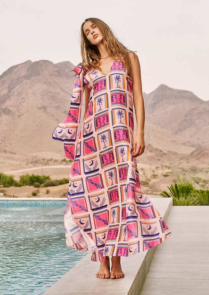Beth is a bold, statement long dress that effortlessly blends artistic flair with summer ease. Crafted in a flowing, relaxed silhouette, the dress showcases striking postage stamps of cobalt hued graphic palm motifs, crescent and geometric shapes. The deep V neckline adds a flattering openness, balanced by an oversized bow on one shoulder that brings in a sense of playful drama. The floor length fall moves with grace, making it ideal for sun drenched escapes or evening resort dinners. Cinch the waist with a slim belt, and finish with strappy flats and a slick ponytail.