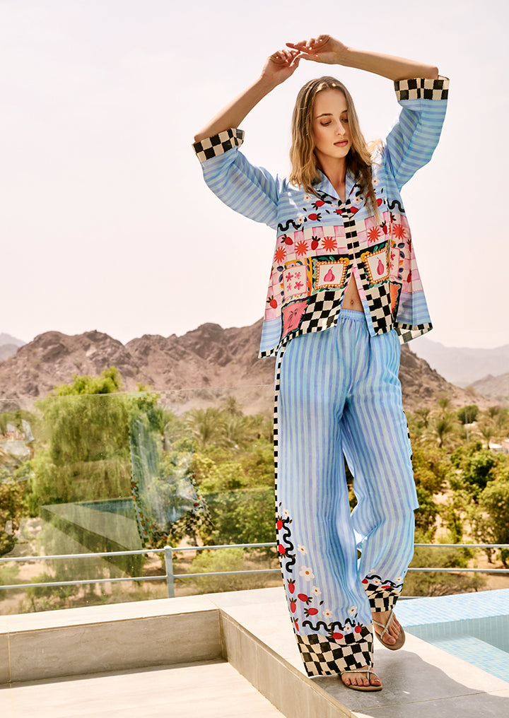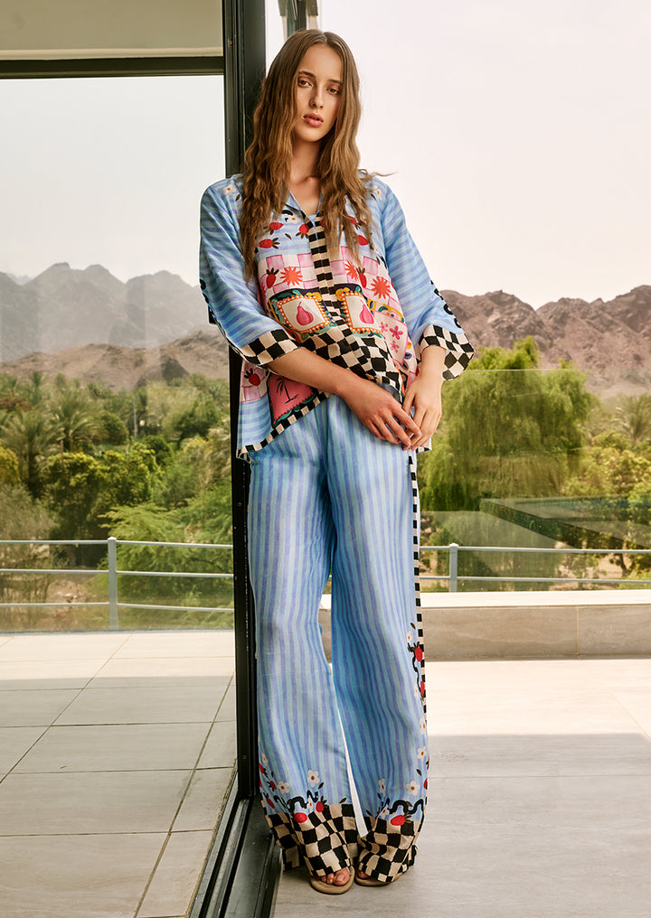 A statement co-ord set crafted in pure raw silk blends misty blue and ivory stripes with playful fruit motifs, blooming florals, and graphic checkered borders in ebony and eggshell.