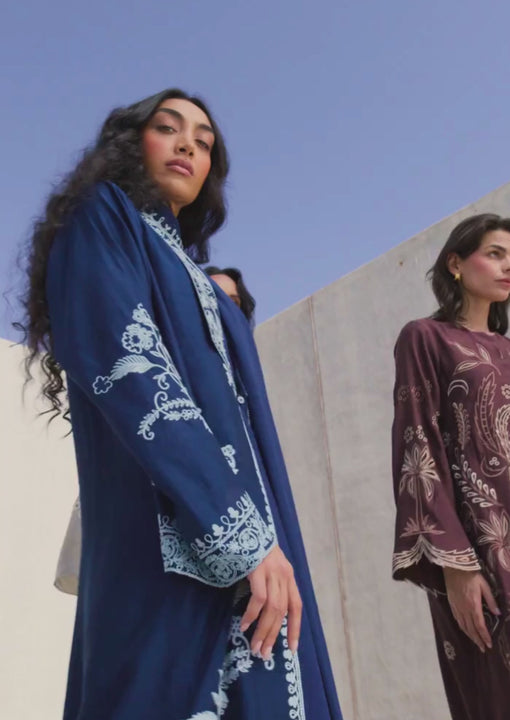 Evoking the quiet beauty of a starlit sky, Fifi Navy is a sophisticated reimagining of the classic abaya. Crafted from textured khaddi corduroy, this deep-hued piece provides a rich, tactile canvas for striking powder-blue embroidery. The design unfolds a botanical narrative, with climbing floral vines and delicate foliage rising gracefully from the hem.