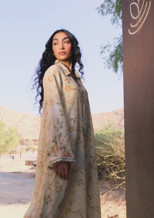 The Iris kaftan merges a warm butter-yellow base with an intricate print of winding floral vines. Its relaxed khaddi silk silhouette features a scalloped collar with delicately embellished edges and a tasseled crisscross neckline, exuding effortless luxury. Wide, flowing sleeves are accented with scalloped pistachio-hued organza inlays and pictorial garden motifs at the cuffs, completing this statuesque resort-ready piece.