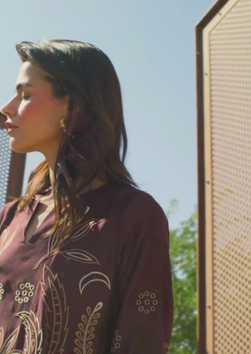 The Lili Chestnut kaftan pairs a deep chocolate khaddi silk base with striking tonal and ivory eyelet embroidery, featuring palm-inspired botanical crests and symmetrical floral vines. Its structured V-neckline and flared sleeves, finished with delicate border detailing, create a statuesque, modern silhouette.